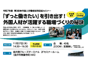【石川県商工会連合会】 令和7年度 第3回◆外国人労働者採用促進セミナー 「ずっと働きたい」を引き出す! 外国人材が活躍する職場づくりの秘訣