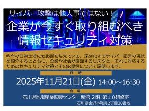 【石川県商工会連合会】 【石川県】サイバーセキュリティセミナーのご案内:11/21(金)